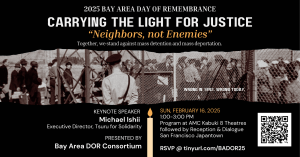 The annual Day of Remembrance (DOR) commemorates the more than 120,000 U.S. citizens and immigrant residents of Japanese ancestry who were forcibly removed from their homes and held behind barbed wire in concentration camps and detention facilities in many parts of the United States during World War II. It is observed on or near February 19th, the date in 1942 when President Franklin D. Roosevelt issued Executive Order 9066, authorizing unjust mass exclusion and incarceration, and setting in motion the tragic events that have not been fully redressed after eight decades.