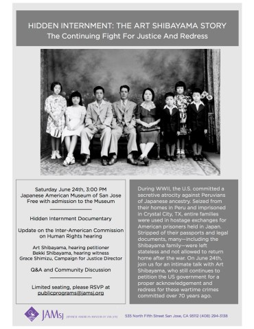 ‘Hidden Internment: The Art Shibayama Story’ was screened at the Japanese American Museum of San Jose to a full crowd. Grace Shimizu provided updates on litigation after the documentary was filmed and on the IACHR hearing, Bekki Shibayama spoke about the impact of the internment experiences on her family, and Art Shibayama answered many questions about his experiences at the end of the program.
