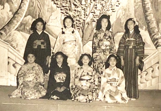 Back row, L to R (Fumiko Kato, Sadako Maoki, Kiyoka Naganuma, Sumika Naganuma) ; Front row, L to R (Setsuko Gushiken, Chieko Kato, Hideko Maoki, Setsuko Miyahira)